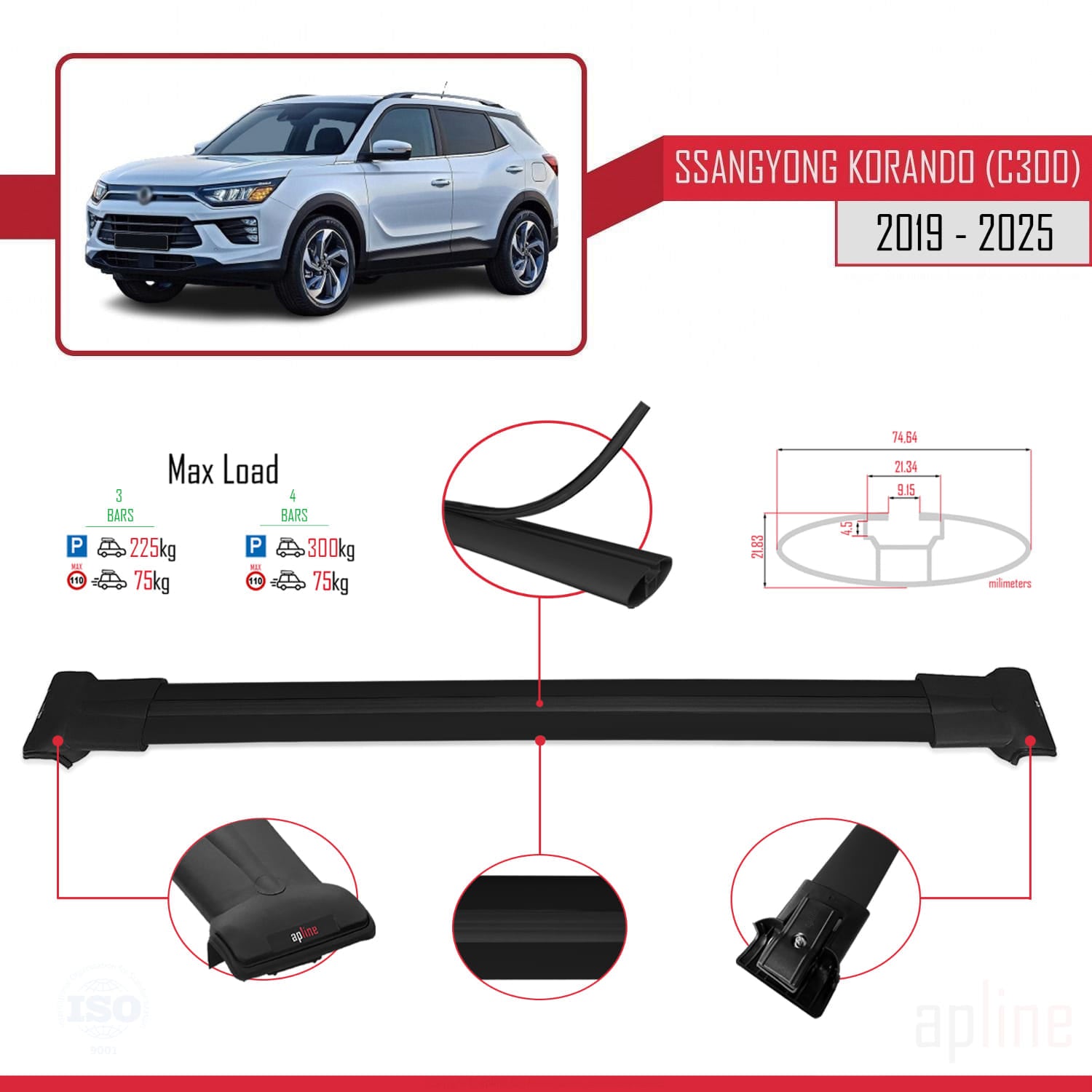 Compatible avec Ssangyong Korando 4 (C300) 2019-2025 FLY Model Barres de Toit Railing Porte-Bagages de Voiture Noir Aluminium 3 Barres
